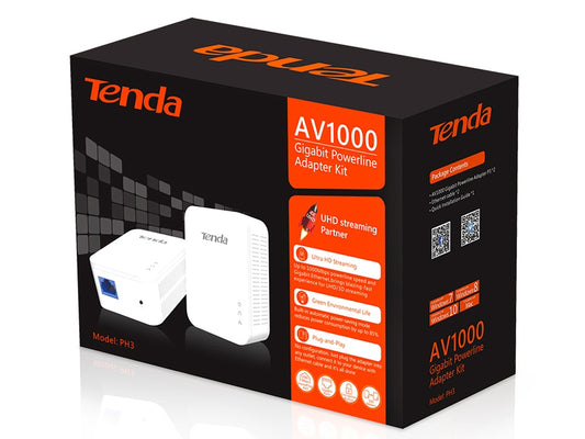 Tenda AV1000 PH3, 1-Port Gigabit Powerline Adapter Kit, Up to 1000Mbps