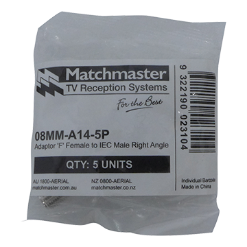- Used to adapt 'F' type male connections to IEC (PAL) male with 90-degree bend radius